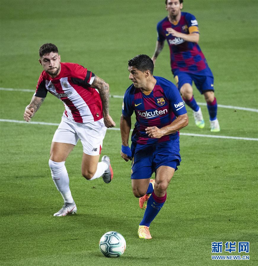6月23日,巴塞罗那队球员苏亚雷斯(前右)与毕尔巴鄂竞技队球员努涅兹拼抢。 当日,在2019-2020赛季西班牙足球甲级联赛第31轮比赛中,巴塞罗那队主场以1比0战胜毕尔巴鄂竞技队。 新华社发(胡安·戈萨摄)