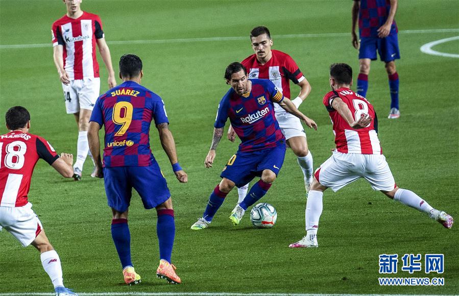 6月23日,巴塞罗那队球员梅西(前右三)在比赛中带球。 当日,在2019-2020赛季西班牙足球甲级联赛第31轮比赛中,巴塞罗那队主场以1比0战胜毕尔巴鄂竞技队。 新华社发(胡安·戈萨摄)