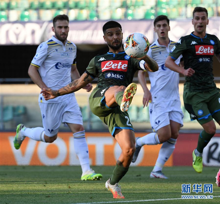 6月23日,那不勒斯队球员因西涅在比赛中控球。 当日,在2019-2020赛季意大利足球甲级联赛第27轮比赛中,那不勒斯队客场以2比0战胜维罗纳队。 新华社发(阿尔贝托·林格利亚摄)