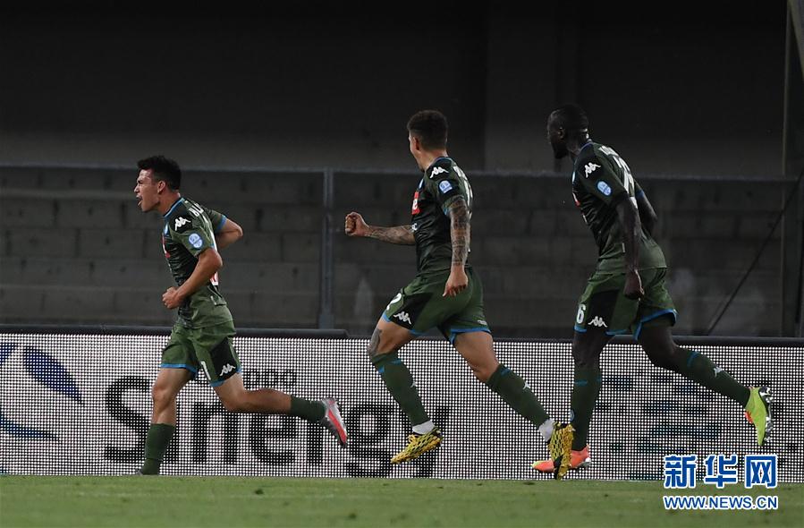 6月23日,那不勒斯队球员洛萨诺(左)在比赛中庆祝进球。 当日,在2019-2020赛季意大利足球甲级联赛第27轮比赛中,那不勒斯队客场以2比0战胜维罗纳队。 新华社发(阿尔贝托·林格利亚摄)