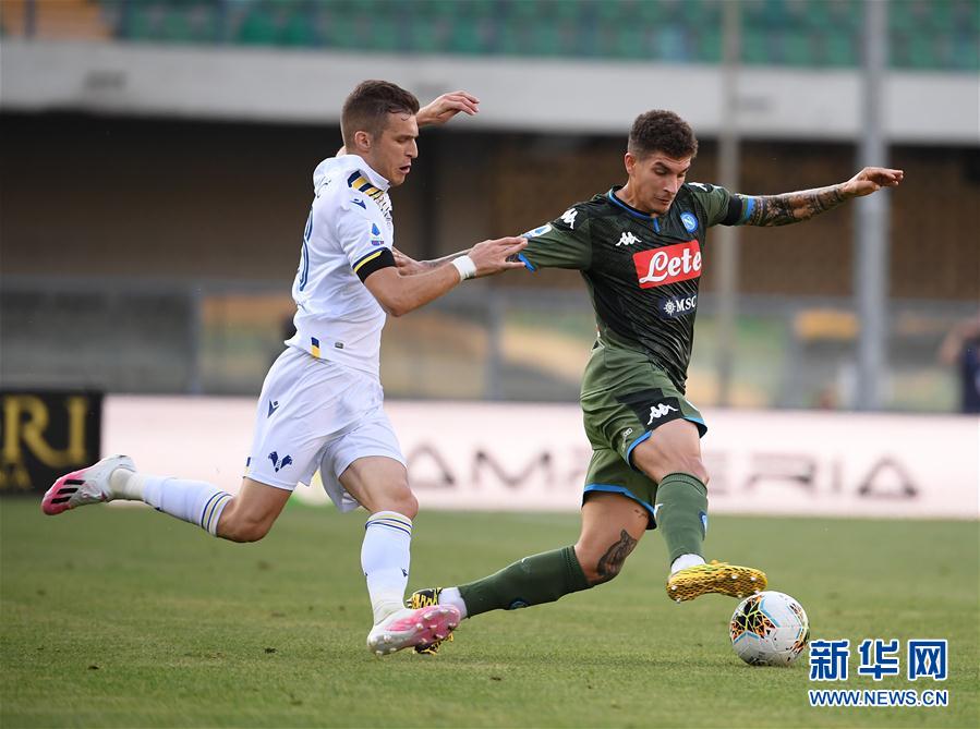 6月23日,那不勒斯队球员迪洛伦佐(右)与维罗纳队球员拉佐维奇在比赛中拼抢。 当日,在2019-2020赛季意大利足球甲级联赛第27轮比赛中,那不勒斯队客场以2比0战胜维罗纳队。 新华社发(阿尔贝托·林格利亚摄)