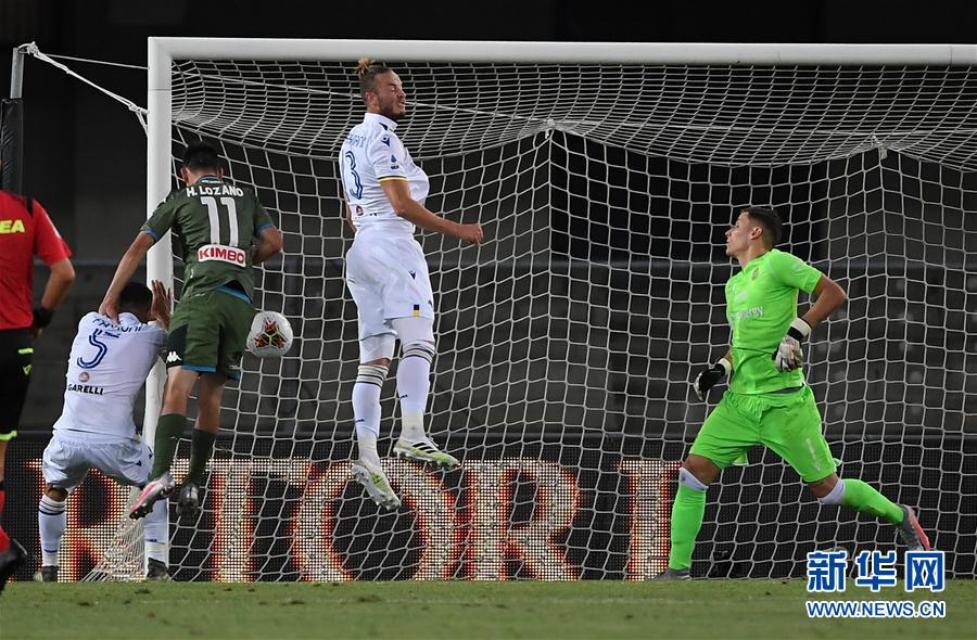 6月23日,那不勒斯队球员洛萨诺(左二)在比赛中破门得分。 当日,在2019-2020赛季意大利足球甲级联赛第27轮比赛中,那不勒斯队客场以2比0战胜维罗纳队。 新华社发(阿尔贝托·林格利亚摄)