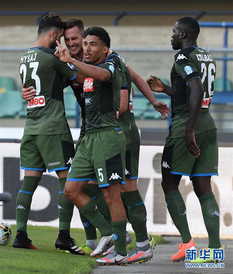 6月23日,那不勒斯队球员在比赛中庆祝进球。 当日,在2019-2020赛季意大利足球甲级联赛第27轮比赛中,那不勒斯队客场以2比0战胜维罗纳队。 新华社发(阿尔贝托·林格利亚摄)