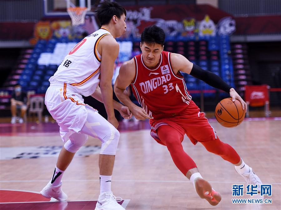 6月24日,青岛国信双星队球员翟逸(右)在比赛中带球突破。 当日,在青岛国信体育馆举行的2019-2020赛季中国男子篮球职业联赛(CBA)复赛第一阶段比赛中,青岛国信双星队以94比82战胜八一南昌队。 新华社记者李紫恒摄