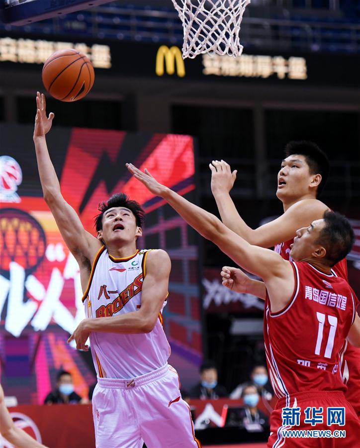6月24日,八一南昌队球员王俊杰(左)在比赛中投篮。 当日,在青岛国信体育馆举行的2019-2020赛季中国男子篮球职业联赛(CBA)复赛第一阶段比赛中,青岛国信双星队以94比82战胜八一南昌队。 新华社记者李紫恒摄