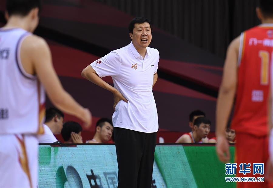 6月26日,八一南昌队主教练王治郅在场边指导队员。 当日,在山东青岛举行的2019-2020赛季中国男子篮球职业联赛(CBA)复赛第一阶段比赛中,浙江稠州银行队以96比79战胜八一南昌队。 新华社记者李紫恒摄