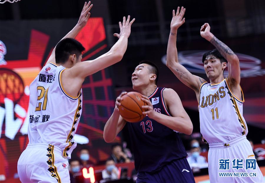6月28日,时代中国广州队球员李炎哲(中)在比赛中伺机上篮。 当日,在青岛国信体育馆举行的2019-2020赛季中国男子篮球职业联赛(CBA)复赛第一阶段比赛中,时代中国广州队以100比92战胜浙江广厦控股队。 新华社记者李紫恒摄