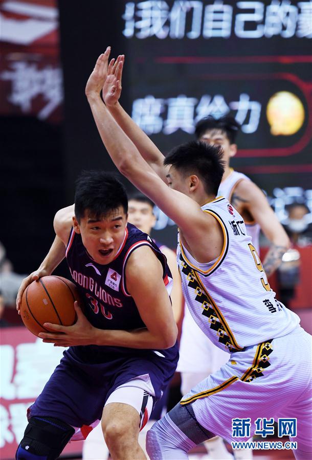 6月28日,浙江广厦控股队球员李京龙(右)在比赛中防守时代中国广州队球员刘丰搏进攻。当日,在青岛国信体育馆举行的2019-2020赛季中国男子篮球职业联赛(CBA)复赛第一阶段比赛中,时代中国广州队以100比92战胜浙江广厦控股队。 新华社记者李紫恒摄