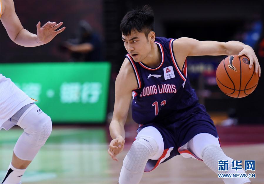 6月28日,时代中国广州队球员贾明儒(右)在比赛中控球。当日,在青岛国信体育馆举行的2019-2020赛季中国男子篮球职业联赛(CBA)复赛第一阶段比赛中,时代中国广州队以100比92战胜浙江广厦控股队。新华社记者李紫恒摄