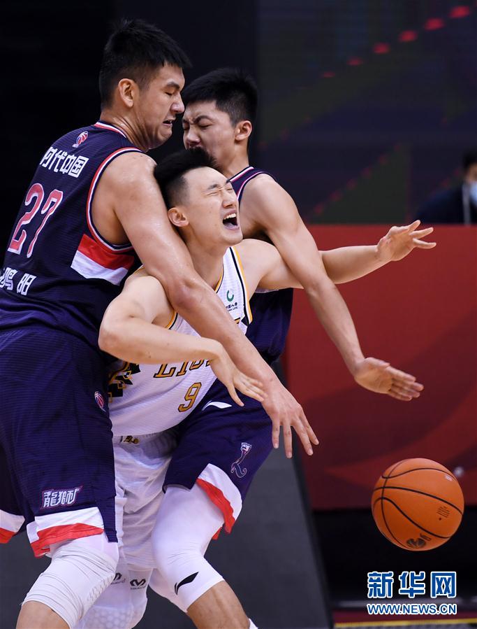 6月28日,浙江广厦控股队球员李京龙(中)在比赛中带球突破受阻。当日,在青岛国信体育馆举行的2019-2020赛季中国男子篮球职业联赛(CBA)复赛第一阶段比赛中,时代中国广州队以100比92战胜浙江广厦控股队。新华社记者李紫恒摄