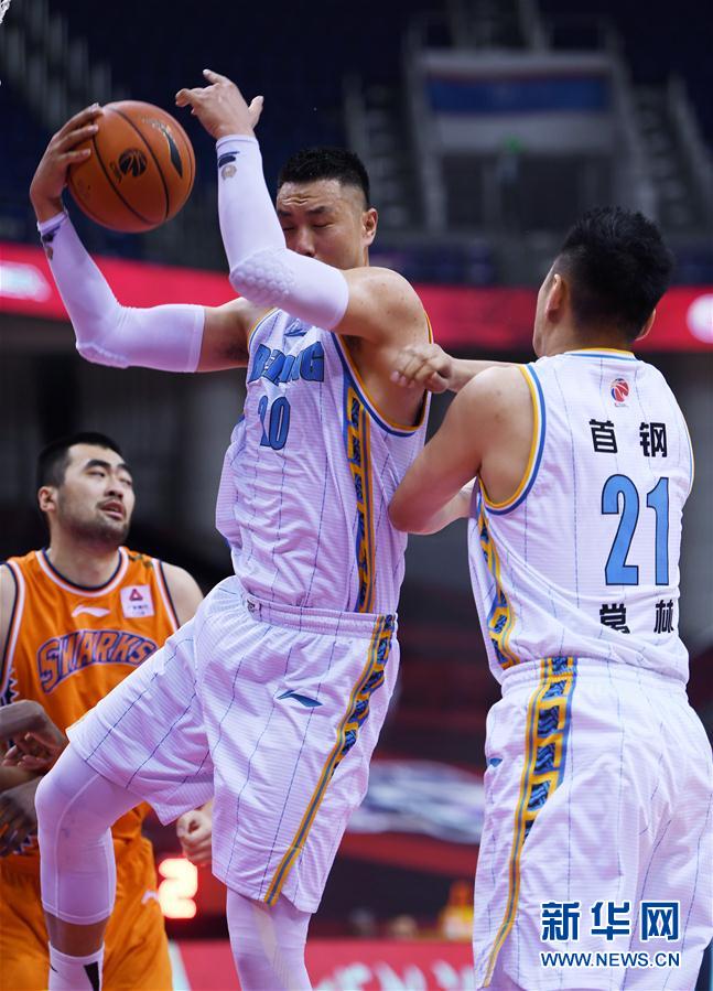 6月28日,北京首钢队球员翟晓川(中)在比赛中拼得篮板球。当日,在山东青岛举行的2019-2020赛季中国男子篮球职业联赛(CBA)复赛第一阶段比赛中,北京首钢队以86比76战胜上海久事队。 新华社记者 李紫恒 摄