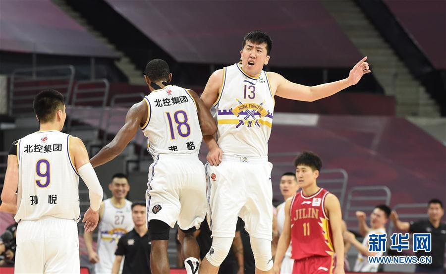 6月28日,北京控股队球员宗赞(前右)与队友弗格(前中)庆祝球队得分。当日,在广东东莞举行的2019-2020赛季中国男子篮球职业联赛(CBA)复赛第一阶段比赛中,北京控股队经过一个加时赛后以117比115战胜吉林九台农商银行队。 新华社记者 卢汉欣 摄