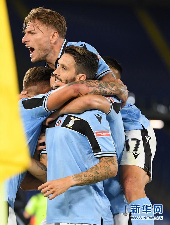 6月27日,拉齐奥队球员阿尔贝托(下)进球后与队友庆祝。 当日,在2019-2020赛季意大利足球甲级联赛第28轮比赛中,拉齐奥队主场以2比1战胜佛罗伦萨队。 新华社发