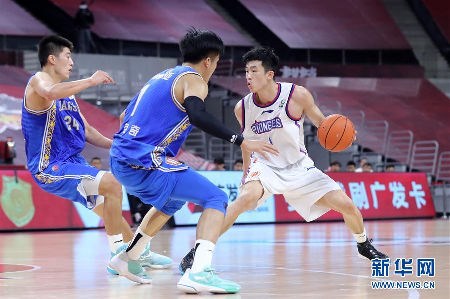 6月28日,天津先行者队球员孟子凯(右)在比赛中带球进攻。 当日,在广东东莞银行篮球中心举行的2019-2020赛季中国男子篮球职业联赛(CBA)复赛第一阶段比赛中,苏州肯帝亚队以120比104战胜天津先行者队。 新华社发