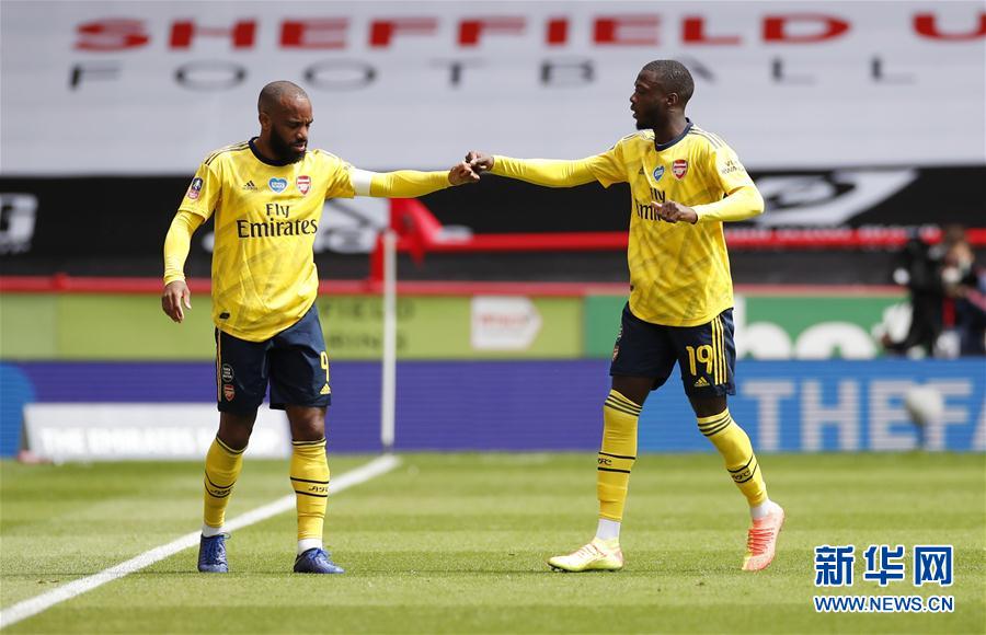 6月28日,阿森纳队球员尼古拉斯·佩佩(右)在罚进点球后和队友拉卡泽特庆祝。 当日,在2019-2020赛季英格兰足总杯四分之一决赛中,阿森纳队客场以2比1战胜谢菲尔德联队,晋级四强。 新华社/路透