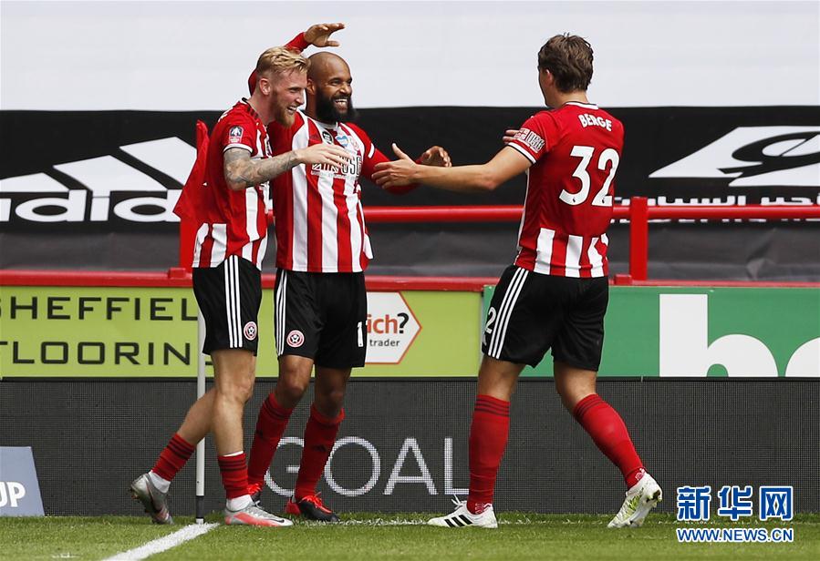6月28日,谢菲尔德联队球员麦戈德里克(中)在进球后和队友庆祝。 当日,在2019-2020赛季英格兰足总杯四分之一决赛中,阿森纳队客场以2比1战胜谢菲尔德联队,晋级四强。 新华社/路透