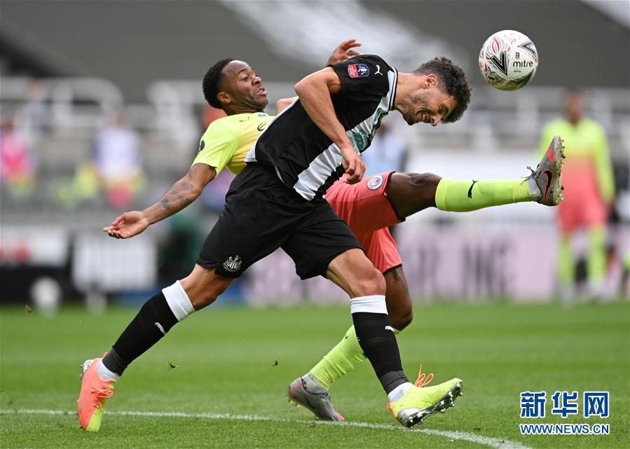 6月28日,曼城队球员斯特林(后)在比赛中和纽卡斯尔联队球员沙尔在比赛中拼抢。 当日,在2019-2020赛季英格兰足总杯四分之一决赛中,曼城队客场以2比0战胜纽卡斯尔联队,晋级四强。 新华社/路透