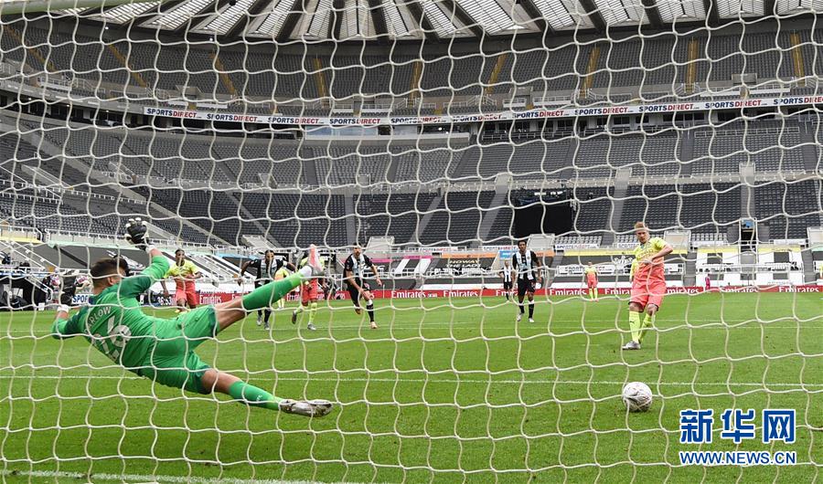 6月28日,曼城队球员德布劳内(右)在比赛中主罚点球命中。 当日,在2019-2020赛季英格兰足总杯四分之一决赛中,曼城队客场以2比0战胜纽卡斯尔联队,晋级四强。 新华社/路透
