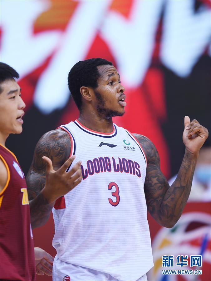 6月29日,时代中国广州队球员亨特(右)在比赛中与裁判沟通。 当日,在青岛国信体育馆举行的2019-2020赛季中国男子篮球职业联赛(CBA)复赛第一阶段比赛中,浙江稠州银行队以111比107战胜时代中国广州队。 新华社记者李紫恒摄