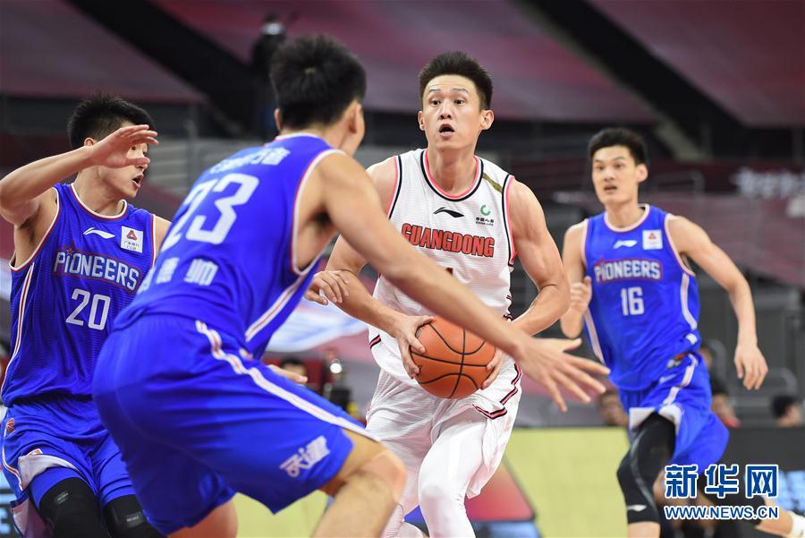 6月29日,广东东莞银行队球员周鹏(右二)在比赛中带球突破。 当日,在2019-2020赛季中国男子篮球职业联赛(CBA)复赛第一阶段比赛中,广东东莞银行队以126比98战胜天津先行者队。 新华社记者卢汉欣摄