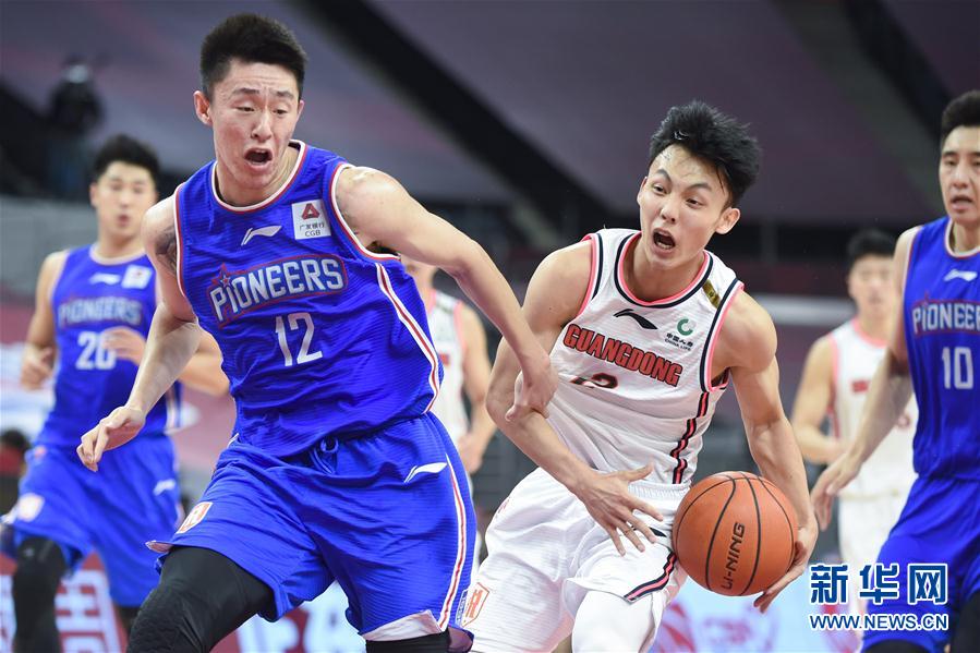 6月29日,广东东莞银行队球员徐杰(前右)在比赛中带球突破。 当日,在2019-2020赛季中国男子篮球职业联赛(CBA)复赛第一阶段比赛中,广东东莞银行队以126比98战胜天津先行者队。 新华社记者卢汉欣摄