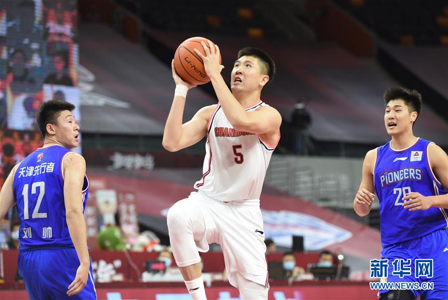 6月29日,广东东莞银行队球员王薪凯(中)在比赛中上篮。 当日,在2019-2020赛季中国男子篮球职业联赛(CBA)复赛第一阶段比赛中,广东东莞银行队以126比98战胜天津先行者队。 新华社记者卢汉欣摄