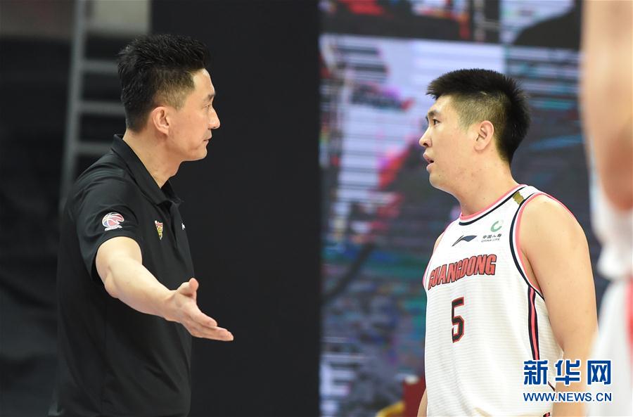 6月29日,广东东莞银行队主教练杜锋(左)在比赛中指导球员王薪凯。 当日,在2019-2020赛季中国男子篮球职业联赛(CBA)复赛第一阶段比赛中,广东东莞银行队以126比98战胜天津先行者队。 新华社记者卢汉欣摄