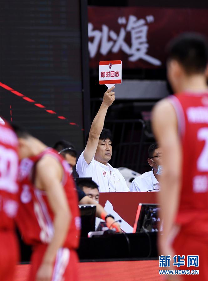 6月29日,裁判员在比赛中申请“即时回放”。 当日,在山东青岛举行的2019-2020赛季中国男子篮球职业联赛(CBA)复赛第一阶段比赛中,辽宁本钢队以109比81战胜青岛国信双星队。 新华社记者李紫恒摄