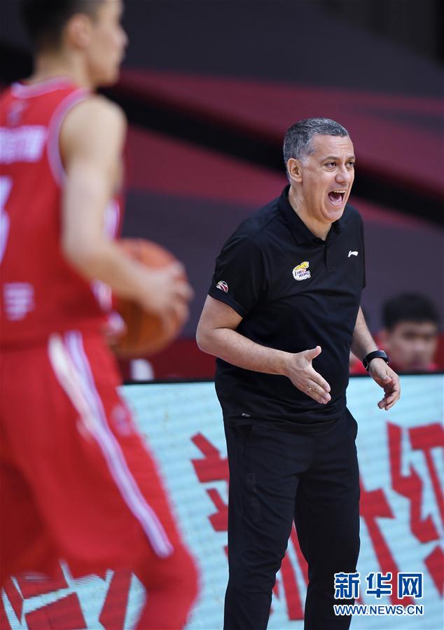 6月29日,辽宁本钢队临时主教练马丁内斯(右)在场边指挥队员。 当日,在山东青岛举行的2019-2020赛季中国男子篮球职业联赛(CBA)复赛第一阶段比赛中,辽宁本钢队以109比81战胜青岛国信双星队。 新华社记者李紫恒摄