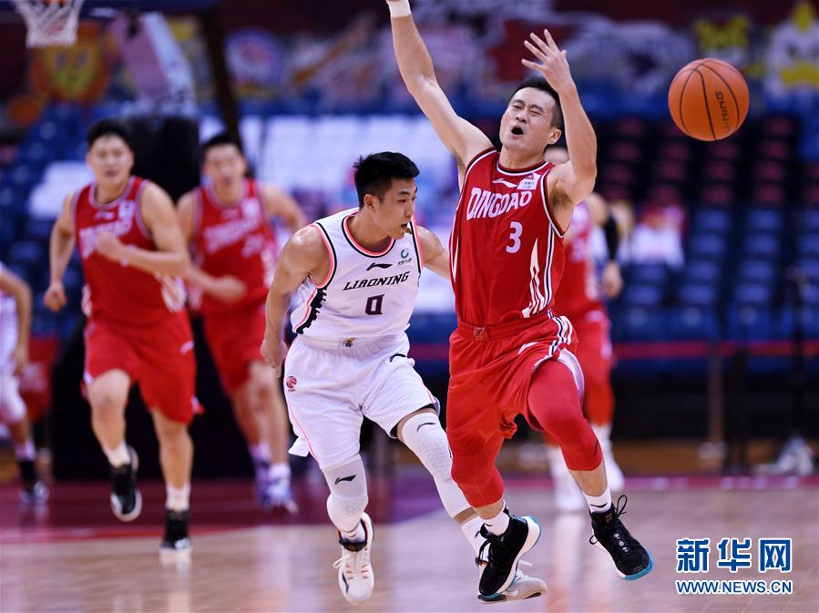 6月29日,青岛国信双星队球员许家晗(右一)在比赛中带球突破受阻。 当日,在山东青岛举行的2019-2020赛季中国男子篮球职业联赛(CBA)复赛第一阶段比赛中,辽宁本钢队以109比81战胜青岛国信双星队。 新华社记者李紫恒摄