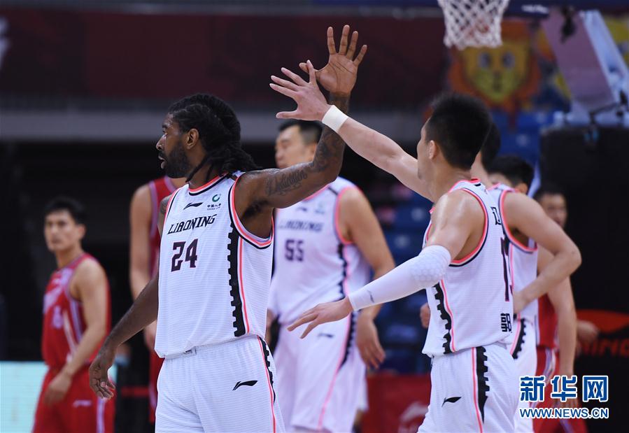 6月29日,辽宁本钢队球员梅奥与队友郭艾伦(前左)在比赛中庆祝进球。 当日,在山东青岛举行的2019-2020赛季中国男子篮球职业联赛(CBA)复赛第一阶段比赛中,辽宁本钢队以109比81战胜青岛国信双星队。 新华社记者李紫恒摄