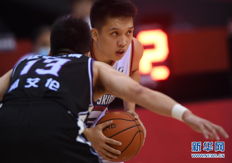 6月30日,南京同曦宙光队球员李柏润(右)在比赛中伺机传球。 当日,在山东青岛举行的2019-2020赛季中国男子篮球职业联赛(CBA)复赛第一阶段比赛中,南京同曦宙光队迎战辽宁本钢队。 新华社记者李紫恒摄
