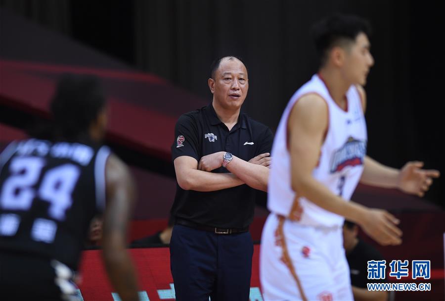 6月30日,南京同曦宙光队主教练崔万军(中)在场边指导队员。 当日,在山东青岛举行的2019-2020赛季中国男子篮球职业联赛(CBA)复赛第一阶段比赛中,南京同曦宙光队迎战辽宁本钢队。 新华社记者李紫恒摄