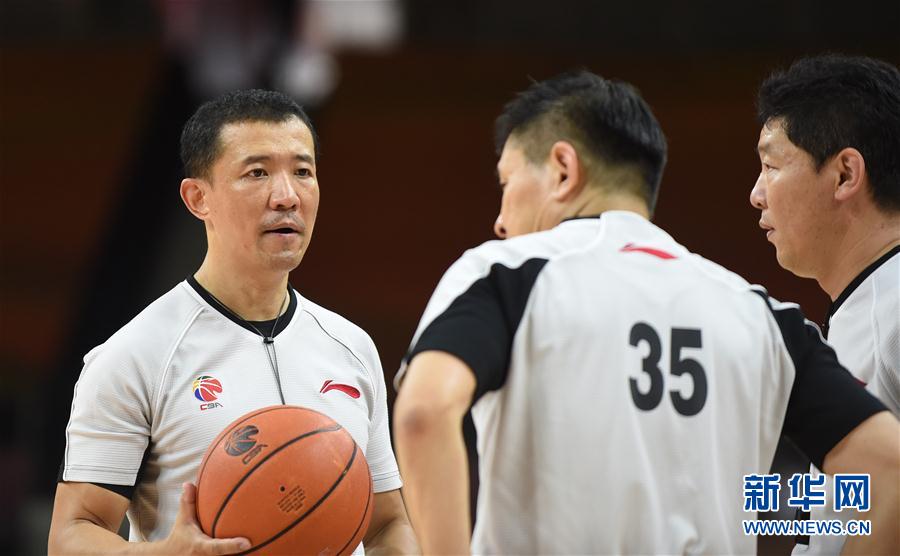 7月1日,裁判在比赛中交流判罚意见。 当日,在广东东莞举行的2019-2020赛季中国男子篮球职业联赛(CBA)复赛第一阶段比赛中,深圳马可波罗队以92比76战胜四川五粮金樽队。 新华社记者 卢汉欣 摄