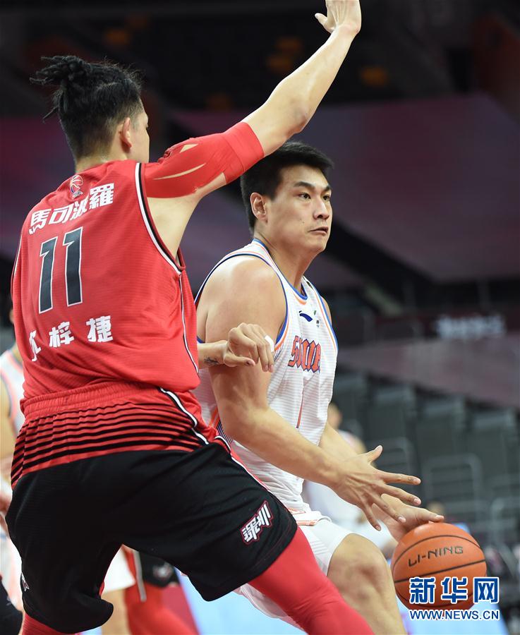 7月1日,四川五粮金樽队球员侯天一(右)在比赛中带球突破。 当日,在广东东莞举行的2019-2020赛季中国男子篮球职业联赛(CBA)复赛第一阶段比赛中,深圳马可波罗队以92比76战胜四川五粮金樽队。 新华社记者 卢汉欣 摄