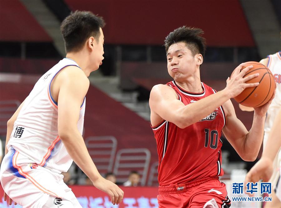 7月1日,深圳马可波罗队球员白昊天(右)在比赛中带球突破。 当日,在广东东莞举行的2019-2020赛季中国男子篮球职业联赛(CBA)复赛第一阶段比赛中,深圳马可波罗队以92比76战胜四川五粮金樽队。 新华社记者 卢汉欣 摄