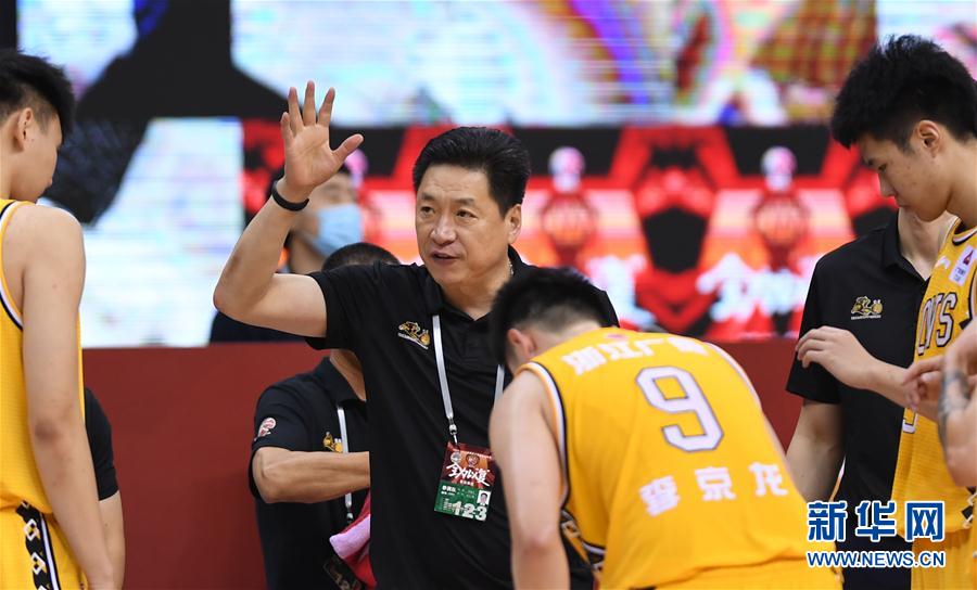 7月1日,浙江广厦控股队主教练李春江(中)在场边指导队员。 当日,在山东青岛举行的2019-2020赛季中国男子篮球职业联赛(CBA)复赛第一阶段比赛中,浙江广厦控股队以100比88战胜青岛国信双星队。 新华社记者 李紫恒 摄