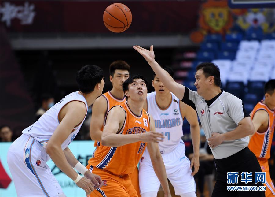 7月1日,上海久事队球员董瀚麟(中)在比赛中准备跳球。 当日,在山东青岛举行的2019-2020赛季中国男子篮球职业联赛(CBA)复赛第一阶段比赛中,上海久事队迎战新疆伊力特队。 新华社记者 李紫恒 摄