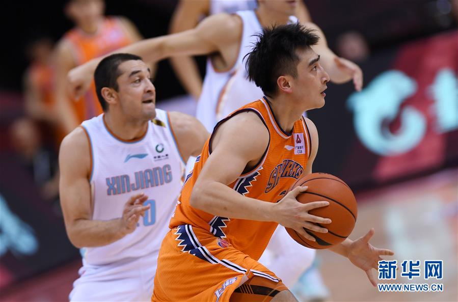 7月1日,上海久事队球员罗汉琛(前)在比赛中带球突破。 当日,在山东青岛举行的2019-2020赛季中国男子篮球职业联赛(CBA)复赛第一阶段比赛中,新疆伊力特队以108比77战胜上海久事队。 新华社记者李紫恒摄
