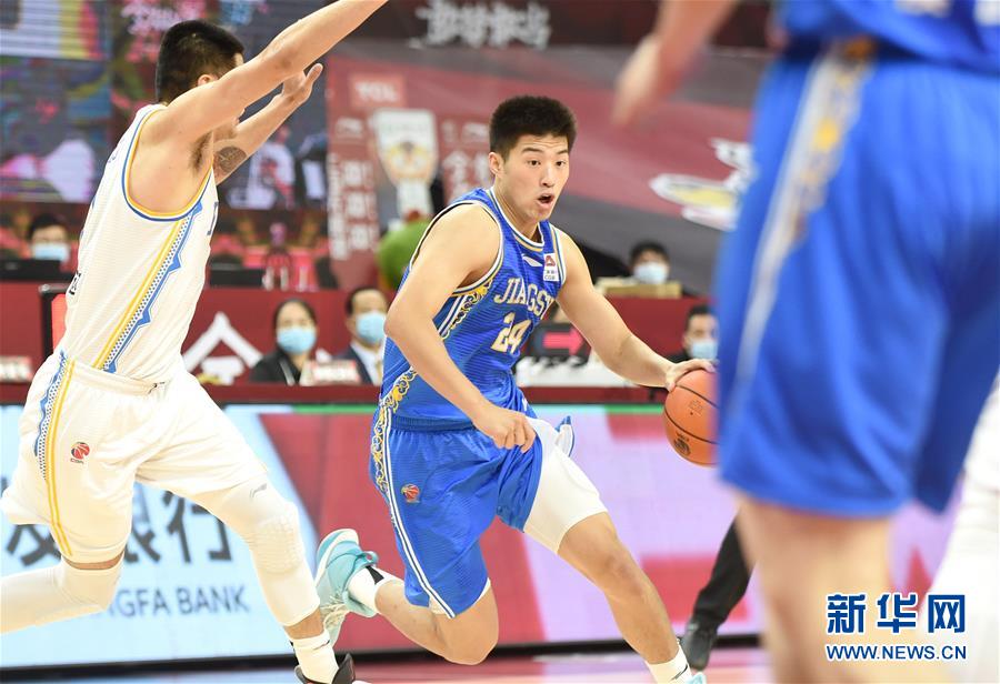7月1日,苏州肯帝亚队球员赵率舟(中)在比赛中带球突破。 当日,在广东东莞举行的2019-2020赛季中国男子篮球职业联赛(CBA)复赛第一阶段比赛中,福建豹发力队以107比96战胜苏州肯帝亚队。 新华社记者 卢汉欣 摄