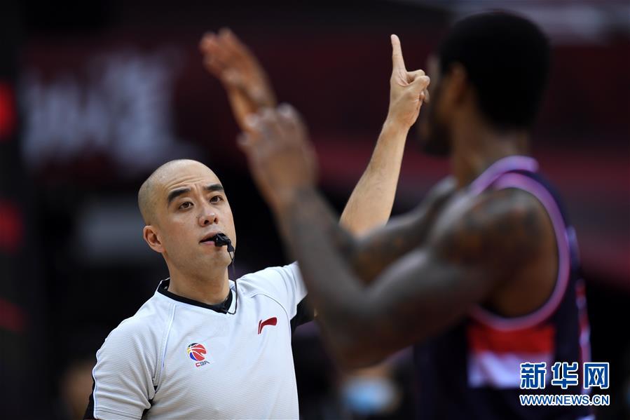7月1日,第二副裁判郭楠(左)在比赛中判罚。 当日,在山东青岛举行的2019-2020赛季中国男子篮球职业联赛(CBA)复赛第一阶段比赛中,北京首钢以96比72战胜时代中国广州队。 新华社记者李紫恒摄