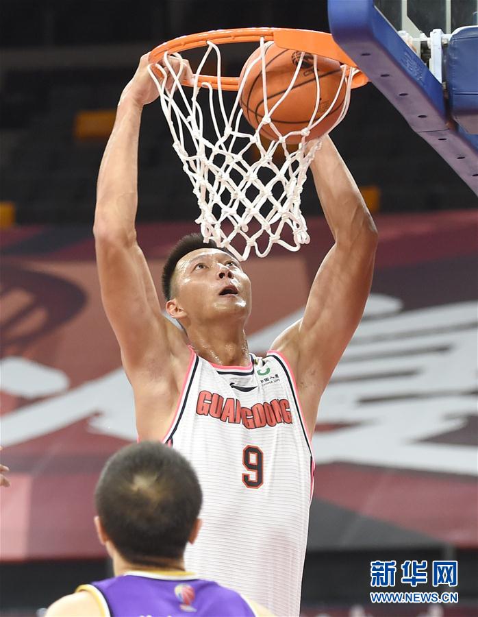 7月1日,广东东莞银行队球员易建联(上)在比赛中扣篮。 当日,在广东东莞举行的2019-2020赛季中国男子篮球职业联赛(CBA)复赛第一阶段比赛中,广东东莞银行队以136比91战胜北京控股队。 新华社记者 卢汉欣 摄