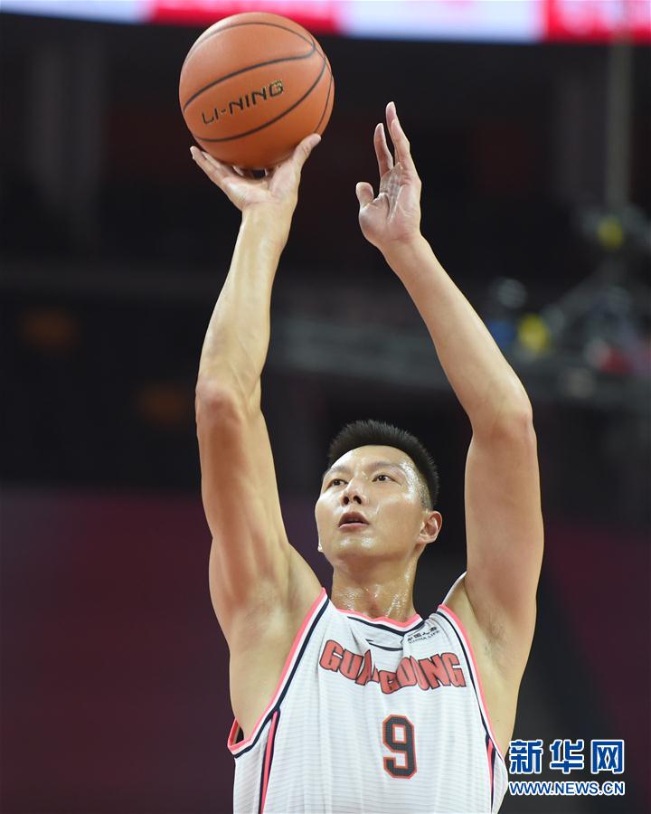 7月1日,广东东莞银行队球员易建联在比赛中投篮。 当日,在广东东莞举行的2019-2020赛季中国男子篮球职业联赛(CBA)复赛第一阶段比赛中,广东东莞银行队以136比91战胜北京控股队。 新华社记者 卢汉欣 摄