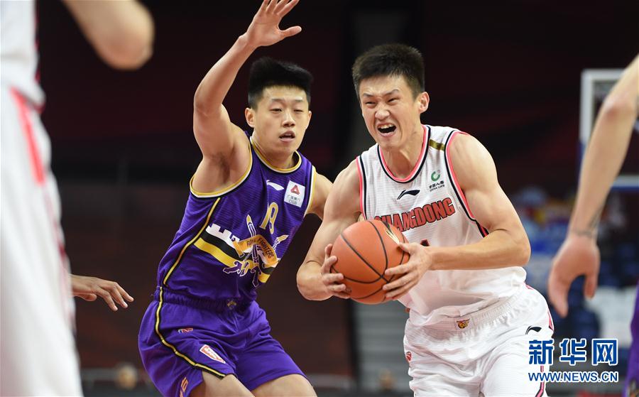7月1日,广东东莞银行队球员周鹏(右)在比赛中带球突破。 当日,在广东东莞举行的2019-2020赛季中国男子篮球职业联赛(CBA)复赛第一阶段比赛中,广东东莞银行队以136比91战胜北京控股队。 新华社记者 卢汉欣 摄