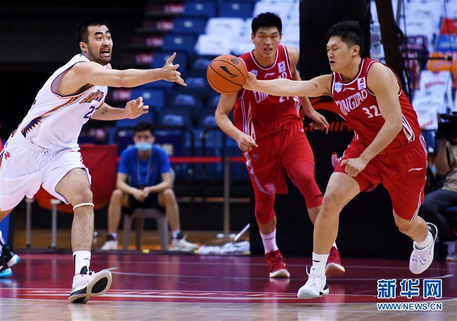7月2日,上海久事队球员张兆旭(左)在比赛中防守青岛国信双星队球员王庆明(右)的传球。 当日,在山东青岛举行的2019-2020赛季中国男子篮球职业联赛(CBA)复赛第一阶段比赛中,青岛国信双星队迎战上海久事队。 新华社记者李紫恒摄