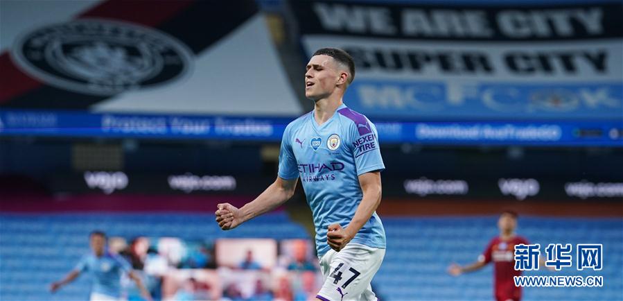 7月2日,曼城队球员福登在进球后庆祝。 当日,在2019-2020赛季英格兰足球超级联赛第32轮比赛中,曼城队主场以4比0战胜利物浦队。 新华社/路透