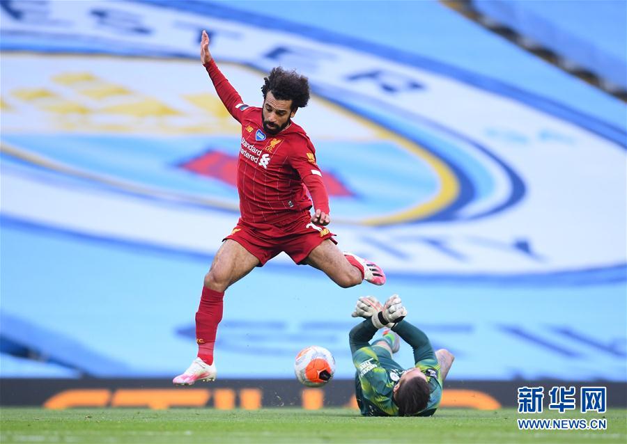 7月2日,利物浦队球员萨拉赫(上)在比赛中和曼城队守门员埃德森拼抢。 当日,在2019-2020赛季英格兰足球超级联赛第32轮比赛中,曼城队主场以4比0战胜利物浦队。 新华社/路透
