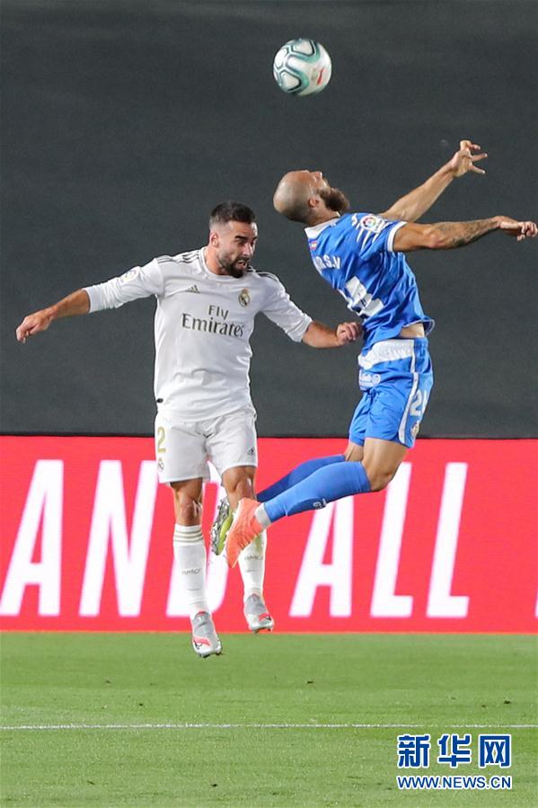 7月2日,皇家马德里队球员卡瓦哈尔(左)与赫塔菲队球员蒂莫尔在比赛中争顶。 当日,在2019-2020赛季西班牙足球甲级联赛第33轮比赛中,皇家马德里队主场以1比0战胜赫塔菲队。 新华社发(爱德华·皮特斯 摄)
