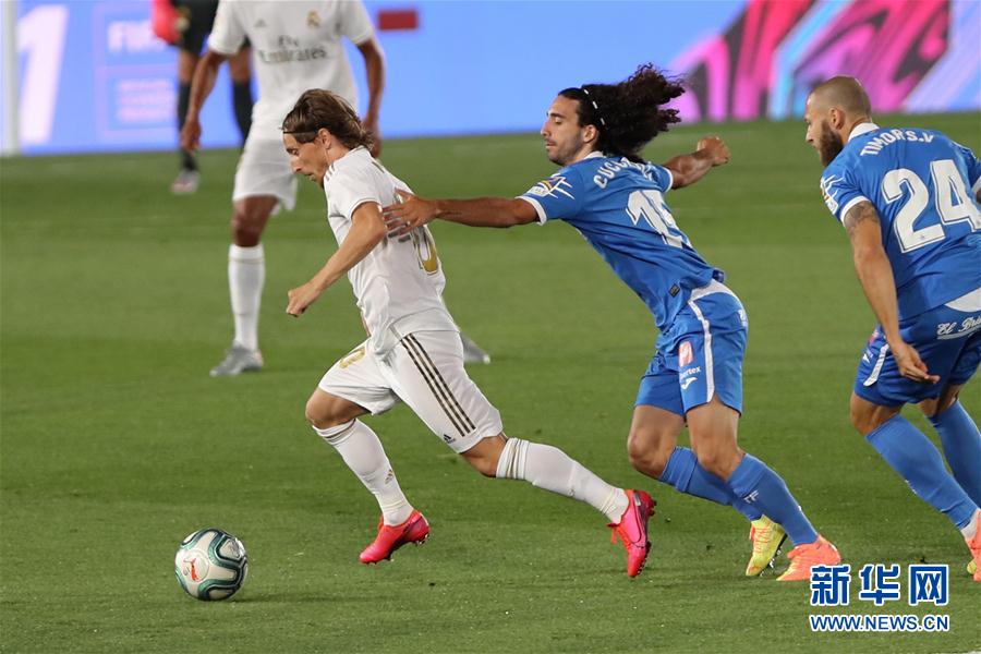 7月2日,皇家马德里队球员莫德里奇(左)在比赛中带球突破。 当日,在2019-2020赛季西班牙足球甲级联赛第33轮比赛中,皇家马德里队主场以1比0战胜赫塔菲队。 新华社发(爱德华·皮特斯 摄)