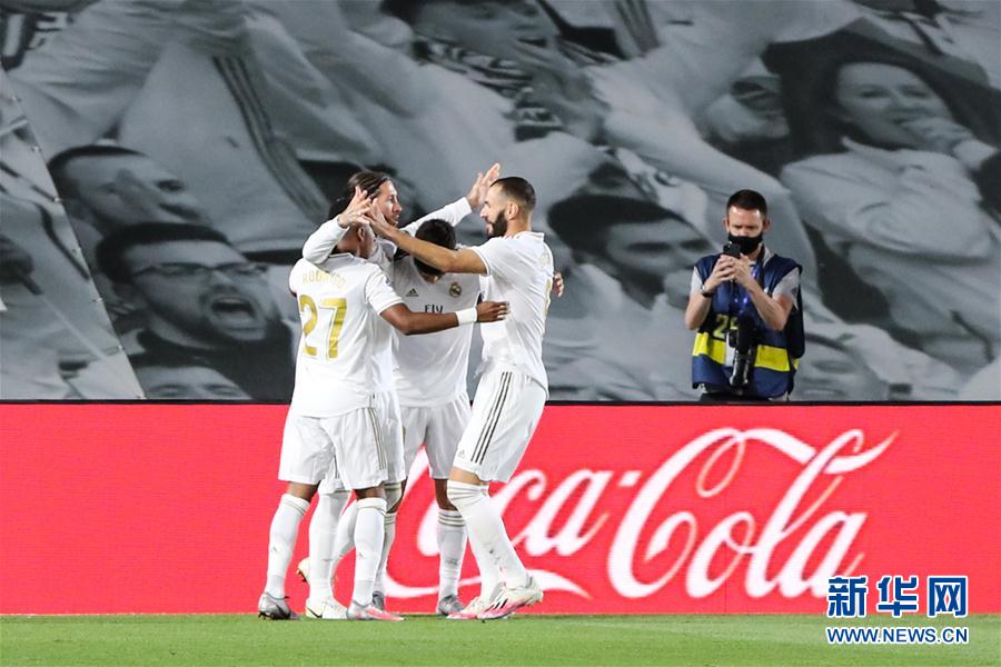 7月2日,皇家马德里队球员在比赛中庆祝进球。 当日,在2019-2020赛季西班牙足球甲级联赛第33轮比赛中,皇家马德里队主场以1比0战胜赫塔菲队。 新华社发(爱德华·皮特斯 摄)